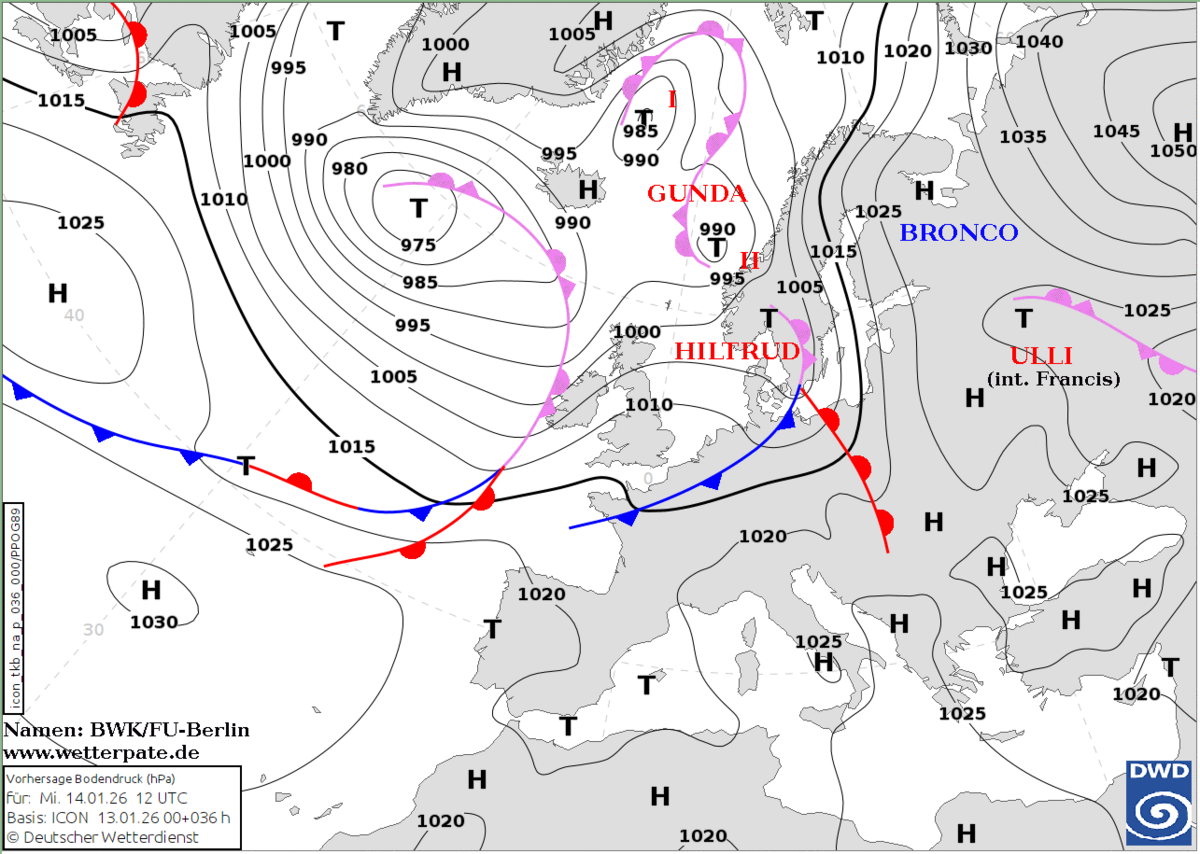 Am heutigen Mittwoch bringen die Ausläufer des Tiefs HILTRUD regional Niederschläge. Im Süden bleibt es dagegen sehr wahrscheinlich trocken, und zwischendurch zeigt sich sogar die Sonne. Lediglich an der unteren Donau hält sich ganztägig dichter Nebel mit trübem Wetter. Auch im Nordwesten und Norden lockert die Bewölkung zeitweise auf, dort bleibt es überwiegend trocken. Die Temperaturen steigen auf 6 bis 14 Grad, im Südosten und Osten werden 2 bis 8 Grad erreicht. In der Nacht zum Donnerstag ist die Frostgefahr insgesamt gering. Nur bei längerem Aufklaren im Süden und im äußersten Norden kann es zu leichtem Frost kommen, dort besteht stellenweise Glättegefahr. Ansonsten bleibt das Risiko gering.