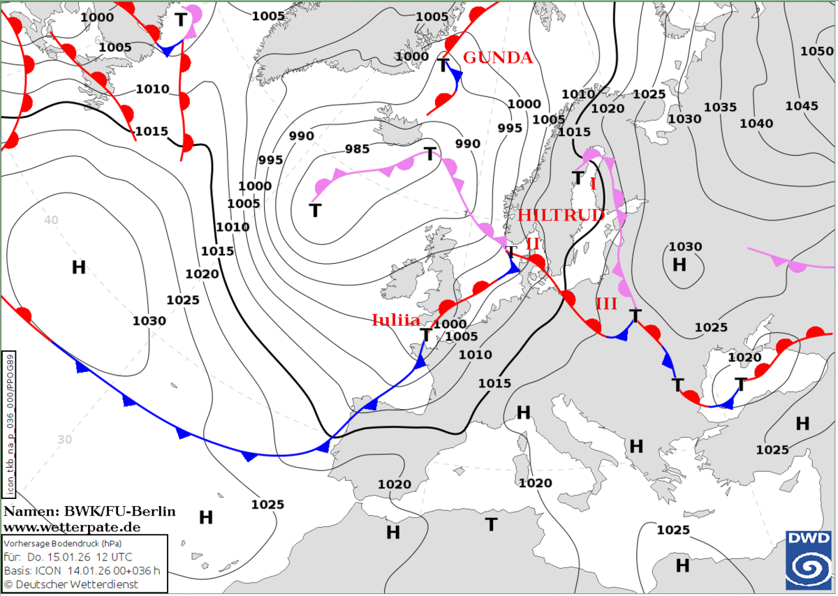 Der Donnerstag beginnt vielerorts grau und trüb, zeitweise fällt etwas Regen oder Sprühregen. Von Südwesten her lockert die Bewölkung jedoch nach und nach auf, und die Sonne zeigt sich immer häufiger. Die Höchsttemperaturen liegen zwischen 6 und 14 Grad, im Nordosten sowie an der unteren Donau zwischen 2 und 5 Grad. In der Nacht zum Freitag nimmt die Frostgefahr vor allem in der Südosthälfte zu, da es dort oft gering bewölkt bleibt. Stellenweise bildet sich Nebel, und örtlich kann es durch überfrierende Nässe glatt werden. In der Nordwesthälfte ziehen dagegen dichtere Wolken durch, die kaum Niederschlag bringen, aber dafür sorgen, dass die Temperaturen über dem Gefrierpunkt bleiben.