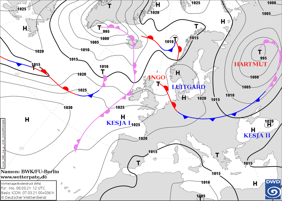 Nun kommen wir zu den Frauen bzw. Hochdruckgebieten des heutigen Tages: KESJA und LUITGARD. Die eine zieht sich Richtung Atlantik zurück, die andere liegt über dem Norden und Nordosten Deutschlands und reicht bis nach Schweden und Norwegen. Dazwischen haben sich zwei "Herren" verbunden: HARTMUT und INGO. Ihr Band reicht einmal quer über Deutschland, vom Nordwesten/Westen bis in den Osten. Es ist markiert durch Wolken und Niederschläge, wobei in den Bergen noch einmal Schnee fällt. KESJA und LUITGARD halten Wolken und Niederschläge von ihren Regionen fern und sorgen durch Absinken für heiteres oder sonniges Wetter.