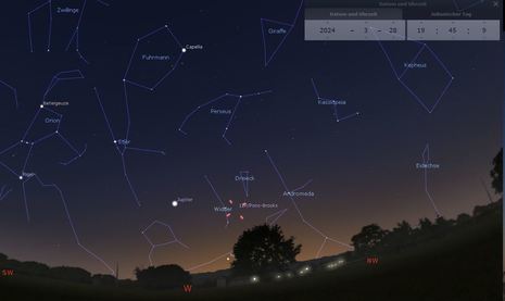 Um den Kometen zu beobachten, sollte man sich gegen 20:00 Uhr Richtung West-Nordwesten orientieren, wo der Komet knapp über dem Horizont zu finden ist. Ein guter Anhaltspunkt ist der Planet Jupiter, der als hellster Stern im Westen zu sehen ist. Von dort aus bewegt man sich ein Stück nach Norden und ein wenig nach unten. Obwohl der Komet normalerweise so hell ist wie schwache Sterne, wird sein Licht aufgrund seiner geringen Höhe über dem Horizont durch die Atmosphäre stark geschwächt. So hat man mit bloßem Auge kaum eine Chance. Daher empfiehlt es sich, ein Fernglas zur Beobachtung zu verwenden.