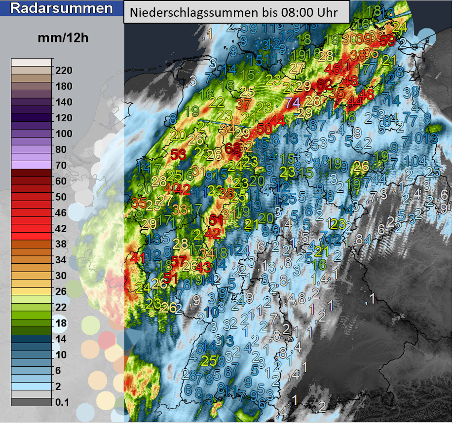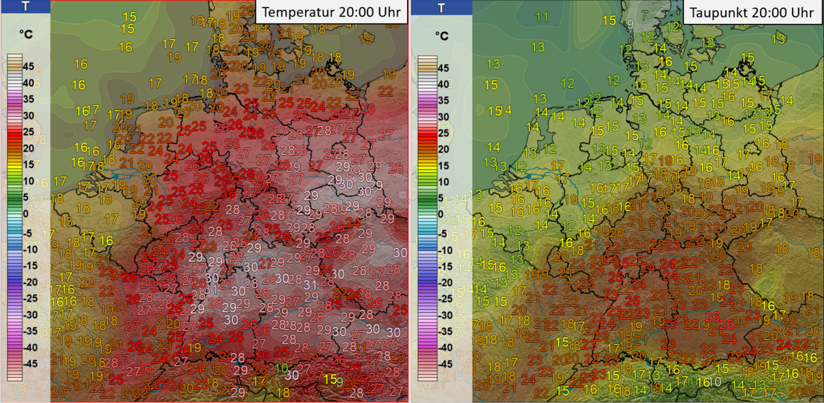 ANNELIE hatte ihren Ursprung über Südostfrankreich und verlagerte sich im Laufe des gestrigen Samstags in den Westen Deutschlands. Dabei wurden auf der Vorderseite des Tiefs heiße und sehr feuchte Luftmassen herangeführt. Im Süden stiegen die Temperaturen in den Niederungen auf schweißtreibende Werte von deutlich über 30 Grad an. Spitzenreiter war Kitzingen mit 35,0 Grad. Zudem war die Luftmasse sehr feucht. Am Abend lagen die Taupunkte in der Südhälfte verbreitet bei über 20 Grad. Stellenweise wurden sogar Taupunkte um 25 Grad registriert.