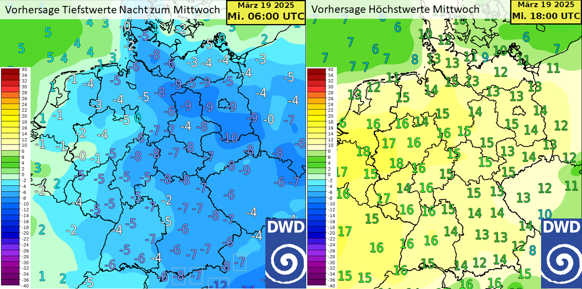 Die Temperatur steigt im Westen und Südwesten tagsüber mit Unterstützung der kräftigen Märzsonne auf bis zu 13 Grad an, am morgigen Mittwoch werden sogar frühlingshafte 18 Grad erreicht. Dennoch zeigt sich in den Nächten, was in der trockenen Polarluft steckt. Bei klarem Himmel sinkt die Temperatur recht verbreitet in den leichten bis mäßigen Frostbereich ab. In der kommenden Nacht zum Mittwoch sind im Osten vereinzelt erneut bis zu -10 Grad nicht ausgeschlossen.