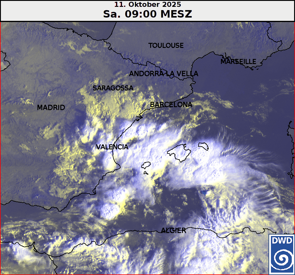Bereits am vergangenen Freitag, den 10. Oktober 2025, bildeten sich im Osten und Südosten Spaniens, besonders in den Provinzen Murcia, Valencia und Alicante wiederholt kräftige Gewitter, die mit sintflutartigen Regenfällen einhergingen. So kam die Wetterstation in Cartagena in der Provinz Murcia auf 156,2 Liter pro Quadratmeter (kurz: l/m²) in nur 24 Stunden. Das entspricht etwas mehr als der Hälfte des Jahresniederschlags der Region.