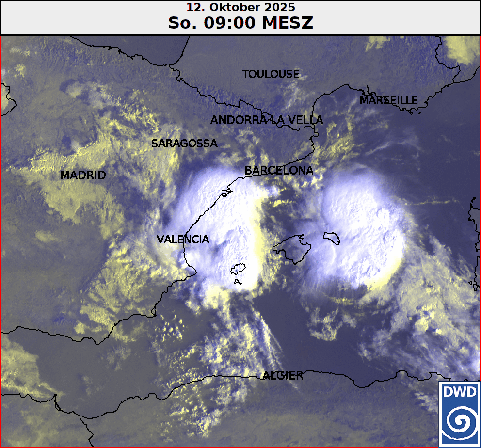 Am heutigen Sonntag (12. Oktober 2025) warnt der spanische Wetterdienst AEMET in den Küstenregionen von der Provinz Valencia bis nach Katalonien vor weiteren kräftigen Gewittern und heftigen Starkregenfällen. Insbesondere im südlichen Katalonien und im nördlichen Castellón wird vor Mengen mit bis zu 140 l/m² gewarnt. Auch auf den Balearen gibt es keine Entwarnung. Dort fallen die Niederschlagsmengen zwar geringer aus, der spanische Wetterdienst warnt jedoch weiterhin mit der Warnstufe Gelb und Orange vor Gewittern und Starkregen.