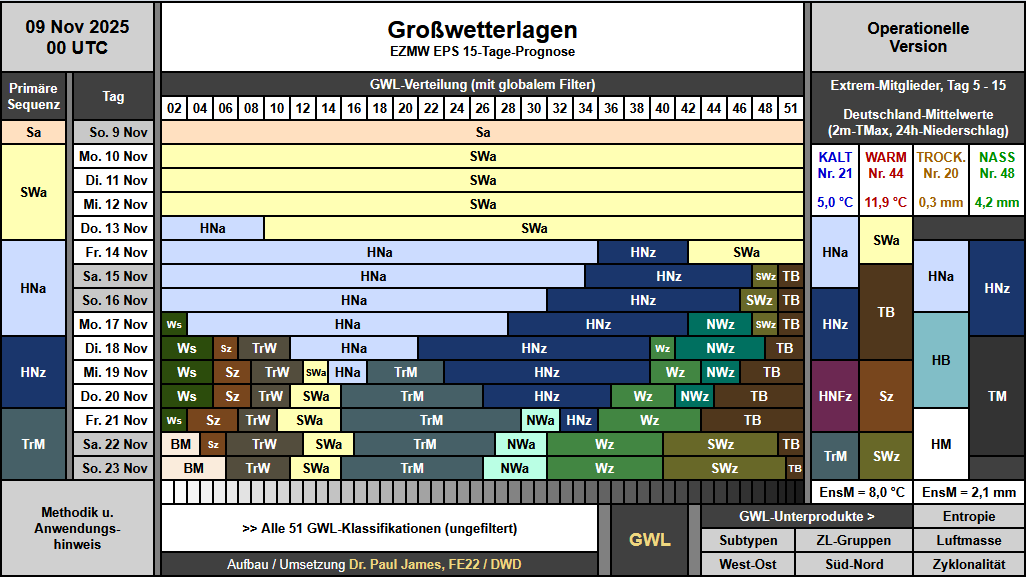 Der Blick auf das europäische Modell bzw. dessen Ensembles (EPS) weist bei der führenden Wetterlage in den kommenden Tagen kaum Veränderungen auf. Während am heutigen Sonntag die Wetterlage Süd antizyklonal das gesamt EPS dominiert, übernimmt ab Montag bis Donnerstag die Wetterlage Südwest antizyklonal. Bevor wir die Wetterlagen genauer unter die Lupe nehmen und das resultierende Wetter erörtern, müssen aber zunächst ein paar Begrifflichkeiten erklärt werden.