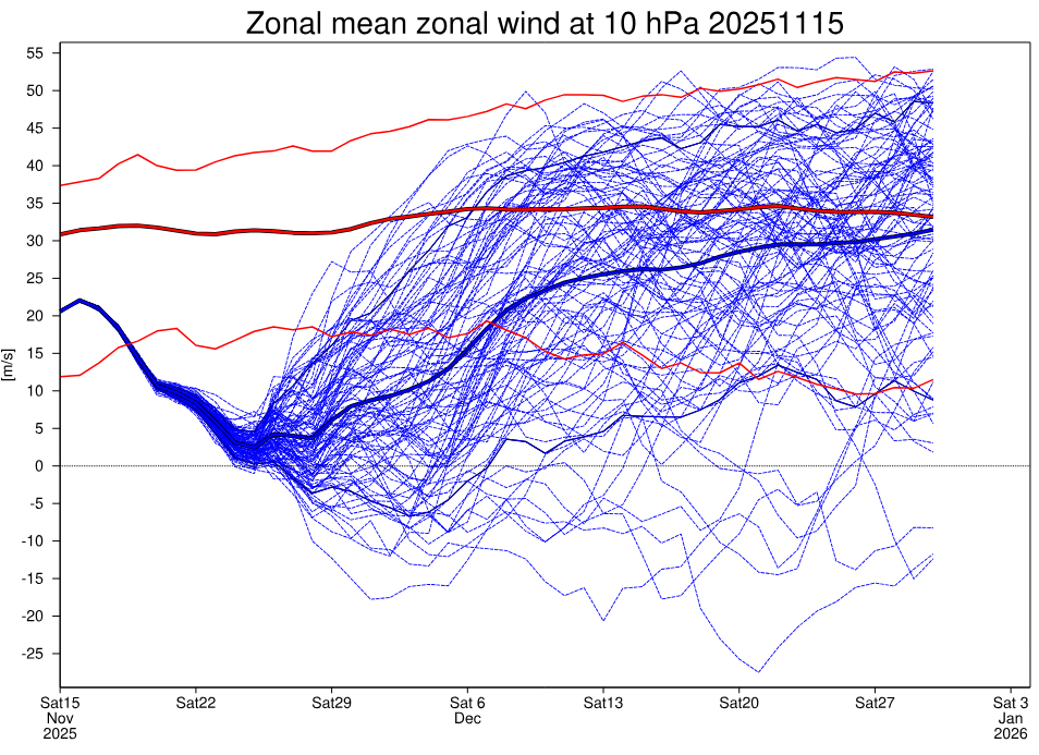 Der sich abschwächende Polarwirbel in der Stratosphäre ist für Winterfans schon mal ein guter Anfang. Günstig wäre ein „major warming“, was uns für Mitte/Ende Dezember eine gute Ausgangslage für Kaltlufteinbrüche bescheren könnte (sollte die Kopplung Stratosphäre-Troposphäre gelingen). Es sieht aber auch im Ensemble vom EZMWF (dem IFS-ENS) eher nach einem „minor warming“ aus, somit ohne Windumkehr und daher weiter anfällig für Störungen aus den außertropischen Bereichen. In dem Fall wäre die treibende Kraft für eventuelle Blockierungslagen eher aus der Troposphäre heraus zu erwarten, was aber mit einer komplexen und nur schwer zu erfassenden Dynamik innerhalb der Troposphäre einhergeht. Zusätzlich erfolgt auch ein komplexes Zusammenspiel mit der tropischen Konvektion und/oder mit der Wasseroberflächentemperatur der Weltmeere.