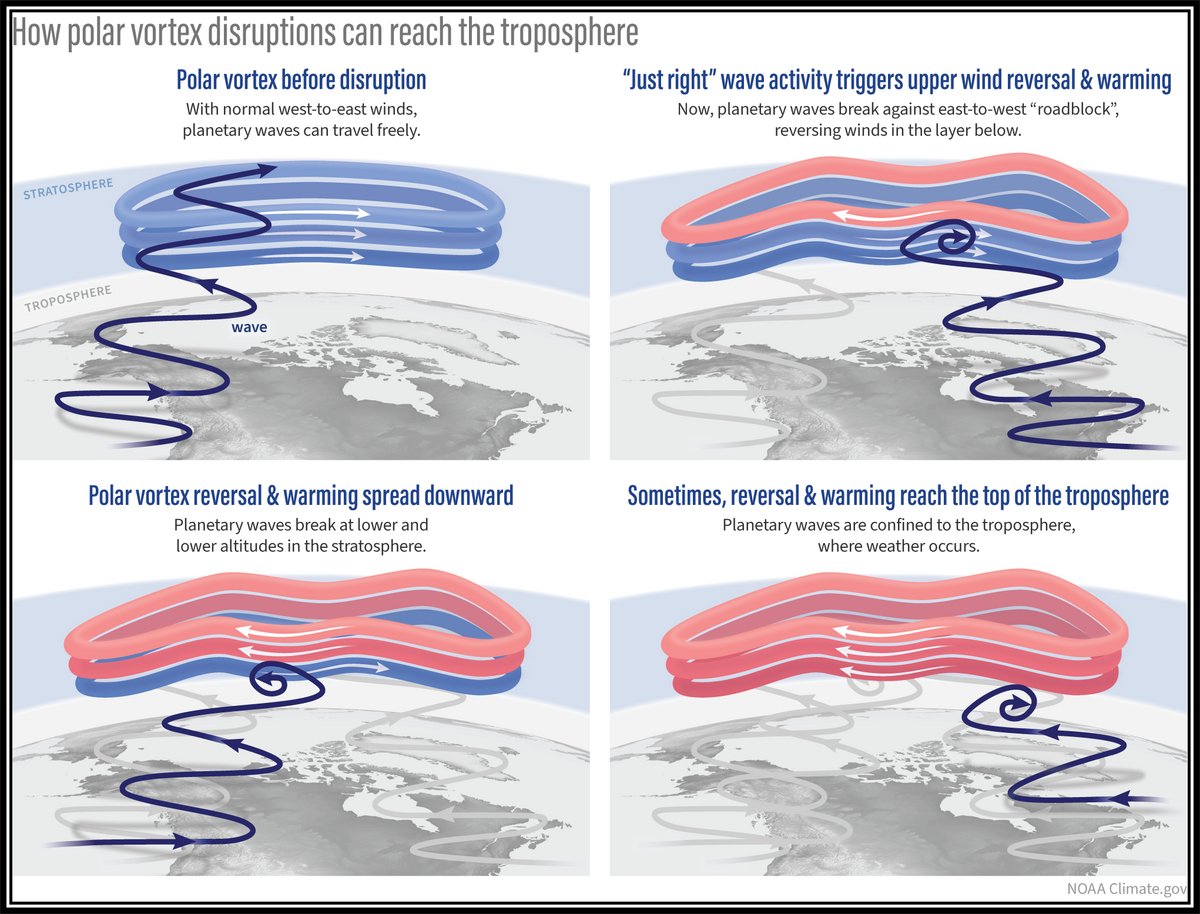 In Bild_1 zeigt die dicke blaue Linie das Mittel des Ensembles vom ECMWF (IFS-ENS) sowie in rot das Mittel der Hintergrundklimatologie des Modells. Dem SPV steht zum Ende dieses Novembers also eine erhebliche Abschwächung bevor, die durch planetare Wellen angetrieben wird. Diese brechen sich in der Stratosphäre (wie Wellen am Strand) und schwächen den aus westlicher Richtung wehenden Polarwirbel mit der Zeit ab. Die Abschwächung erfolgt umso effektiver, je länger diese Störungen andauern. Dies geht teilweise bis hin zur Windumkehr eines „major warmings“, wobei die Wahrscheinlichkeit einer Windumkehr bei diesem Ereignis mittlerweile etwas zurückgegangen ist. Eine schöne Skizze diesbezüglich wurde von den Kollegen der NOAA erstellt.