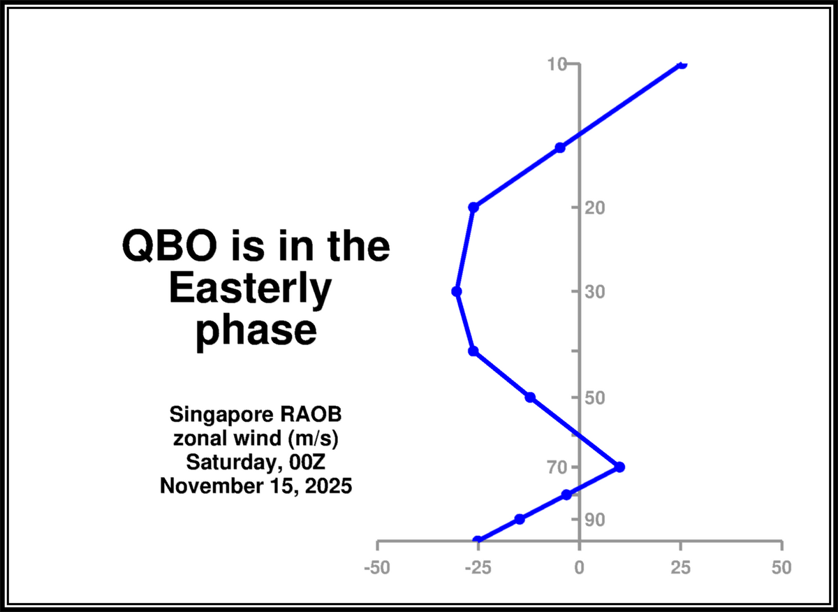 Statistisch gesehen wirkt sich die periodisch wechselnde und sich nun in der östlichen Phase befindende QBO abschwächend auf den SPV aus, was wiederum die Wahrscheinlichkeit für gestörte Phasen des SPV im Verlauf dieses Winters grundsätzlich erhöht.