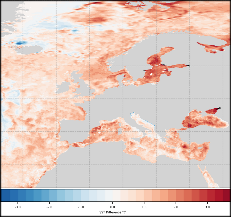 Beim Blick auf die Anomalien der Wasseroberflächentemperaturen rund um Europa fallen beinahe durchweg positiven Anomaliewerte von 0.5 bis 2, lokal bis über 3 Kelvin ins Auge. Arktische Luftmassen, die nun südwärts über diese Wasserflächen geführt werden, können wenigstens in den unteren Bereichen stark modifiziert (sprich: erwärmt) werden. Bei einer aktuell unter dem Interdezilbereich (also zwischen dem 10. und 90. Perzentil der Datenmenge) verlaufenden Meereisverteilung ist auch ausreichend Meeresoberfläche für eine nachhaltige thermische Änderung der einst so eisigen Luftmasse vorhanden. Erschwerend kommt hinzu, dass sich die positiven Anomalien der Wassertemperaturen z.B. auf die regionale Druckverteilung, Aktivität der Konvektion, Lage und Intensität der Jets etc. auswirken können. Dies sät weitere Unsicherheiten in ansonsten bekannten Mustern der Ausbreitung von planetaren Wellen.
