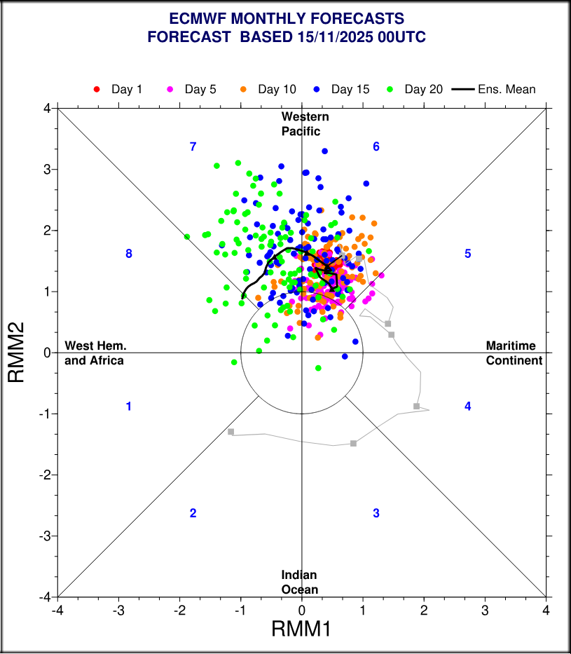 Darin eingebettet wird die Verlagerung der Madden-Julian-Oszillation (MJO) verfolgt, die entweder konstruktiv oder destruktiv mit der ENSO interagiert. Ausgehend von diesen tropischen Konvektionsbereichen werden je nach Intensität und Phase auf troposphärischen Pfaden Rossbywellen in die Außertropen geführt, die nicht selten im Atlantik per Fernwirkung (fachlich: „downstream development“) auch die Nordatlantische Oszillation (NAO) beeinflussen. Aktuell geht die MJO durch Phase 6 in Phase 7, allerdings mit geringer Intensität. Die Fernwirkung für den europäischen Sektor wäre bei Passage dieser MJO-Phasen eigentlich eine blockierungsfreudige. Allerdings darf der Einfluss dieser MJO dank rascher Abschwächung angezweifelt werden. Interessant könnte es werden, sollte sich im Dezember eine neue Welle in diesem Phasenbereich (6 bis 8) entwickeln, was von einzelnen Modellen angedeutet wird.