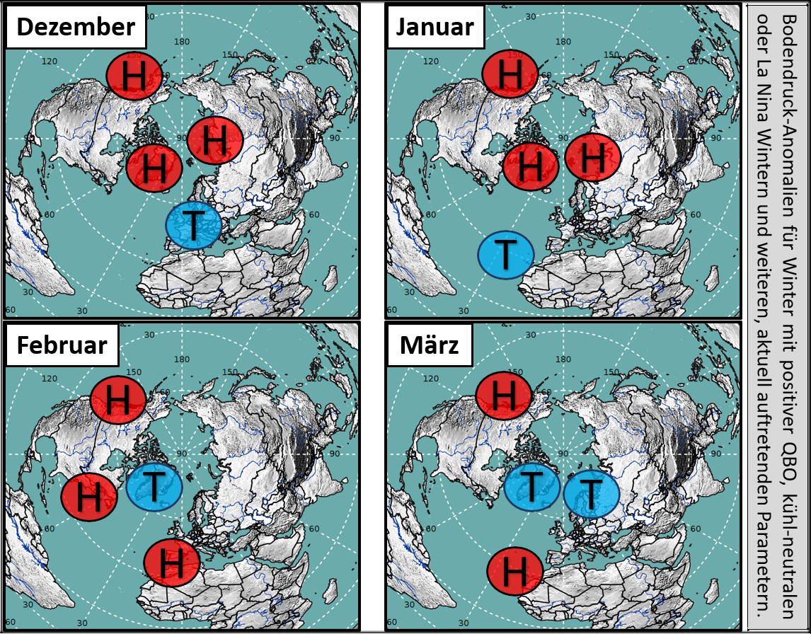 Zum Schluss machen wir es uns aber einfach und schauen, wie sich vergangene Winter mit einer östlichen QBO, einer kühlen/neutralen ENSO oder aber einer La Nina und weiteren, mit der aktuellen Ausgangslage übereinstimmenden Merkmalen entwickelt haben. Es fließen zusätzlich die Ausarbeitungen von Gray et. al. (2004) mit ein [Gray et. al. (siehe "Weitere Informationen zum Thema)].