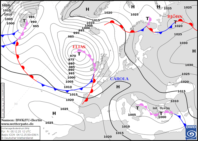 Wer heute Morgen auf die in den Frühstunden des gestrigen Donnerstags veröffentlichte Vorhersagekarte für die Fronten und den Bodendruck geblickt hat, der konnte über dem Absatz des italienischen Stiefels noch das Tief DIETER finden, welches international auf den Namen CASSIO getauft wurde. In der entsprechenden Karte für den morgigen Freitag (Abbildung eins) ist DIETER dagegen nicht mehr zu finden. Stattdessen trifft man auf ein Tief über der Ägäis, das von den zuständigen Kolleginnen und Kollegen den Namen BYRON erhalten hat. Wer dabei glaubt, auf der für morgen gültigen Karte sei DIETER sehr wohl noch vorhanden, und zwar im Bereich von Neapel, der irrt. DIETER hat sich tatsächlich im Bereich der kroatischen Küste abgeschwächt, das „neue“ Italientief ist in Wahrheit ein eingewanderter Korse (eine Korsin?).