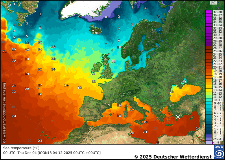 Die Abbildung zwei zeigt entsprechend die aktuellen Wassertemperaturen von heute in den um Europa herum gelegenen Meeren. Während die Ostsee es nur noch auf einstellige Werte (in °C) bringt und auch die Nordsee nur noch mit knapp zweistelligen Wassertemperaturen aufwarten kann, liegen die Oberflächentemperaturen des Wassers im östlichen Mittelmeer um oder sogar über 20 °C – und damit bei Werten, die sich auf Augenhöhe mit den aktuellen täglichen Temperaturmaxima bewegen. Das heißt aber auch: An einem großen Teil des Tages (und in der Nacht ohnehin permanent) liegen die Wassertemperaturen über der Lufttemperatur. Das kann man auch aus der Abbildung drei ableiten. Sie zeigt (ausschnittsweise) das Meteogramm der türkischen Station Dalaman für Freitag bis Sonntag (05.-07.12., Daten nach MOSMIX; die Station ist in der Abbildung zwei durch ein weißes Kreuz gekennzeichnet). Die Höchstwerte liegen in einer Spanne von 16 bis 18 °C, die Tiefstwerte dagegen zwischen 10 und 13 °C, was die oben getätigte Aussage zum Erwärmen der unteren Luftschichten bestätigt.