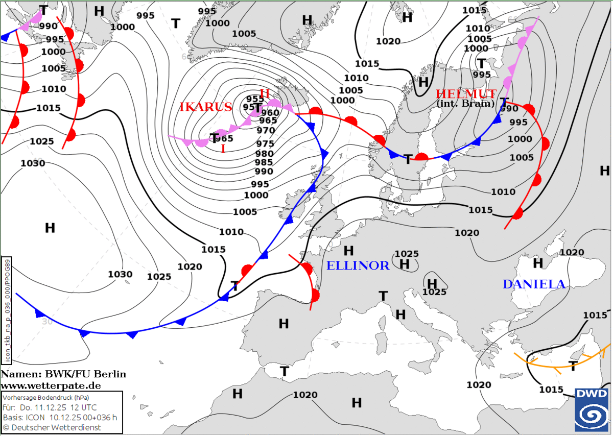 Hauptverantwortlich für dieses für Meteorologen recht eintönige Wetter in den kommenden Tagen ist ein ausgedehntes Hochdruckgebiet namens ELLINOR, das über Mitteleuropa und dem Balkan liegt. Gleichzeitig wüten über dem Nordatlantik, zwischen den Britischen Inseln und Island, kräftige Orkantiefs. Nur vereinzelte, sehr abgeschwächte Ausläufer schaffen es noch bis zu uns.