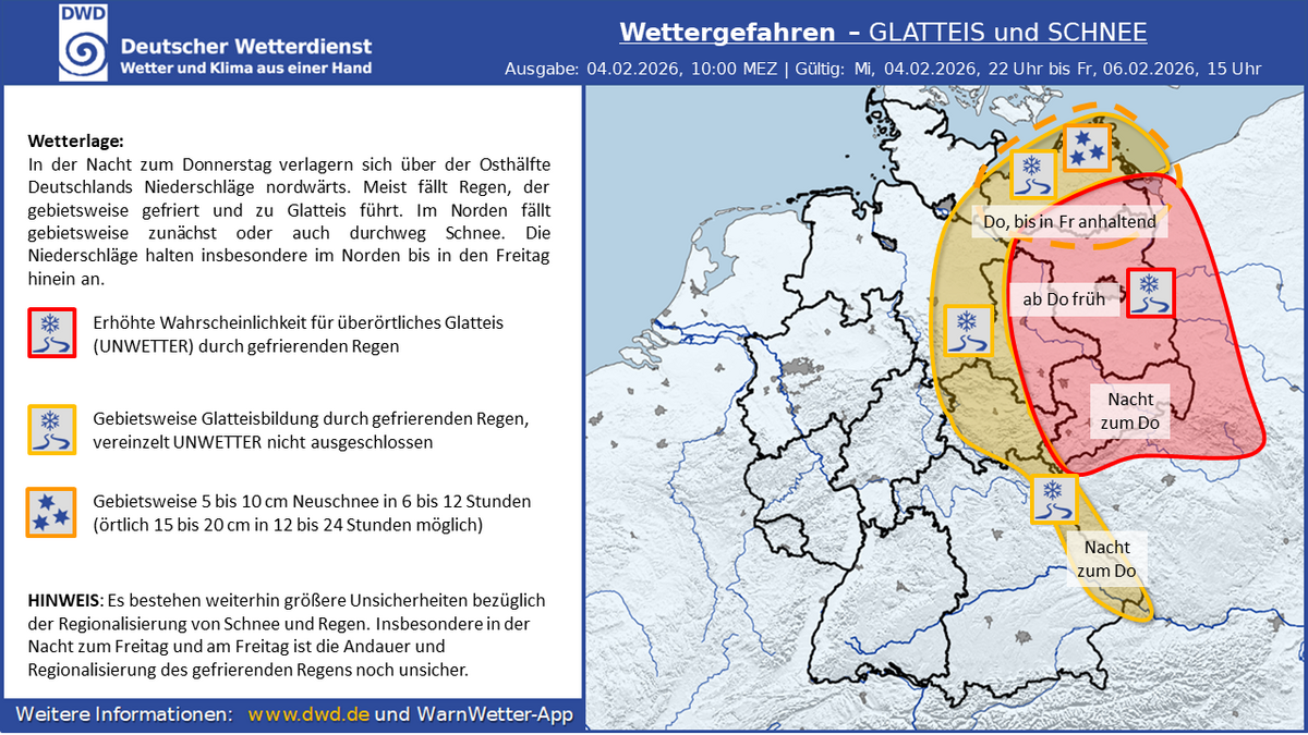 Doch damit nicht genug, steht am morgigen Donnerstag bereits die nächste Glatteislage ins Haus. Dann ist vor allem der Osten Deutschlands betroffen. In der Nacht zum Donnerstag setzen in Ostdeutschland Niederschläge ein, die teils als Regen, teils als Schnee fallen. Vor allem in Teilen Sachsens, Brandenburgs und Berlins besteht dann die Gefahr von Glatteis durch gefrierenden Regen. Donnerstagfrüh breiten sich die Niederschläge weiter nach Norden aus und erfassen auch Mecklenburg-Vorpommern und Schleswig-Holstein. Dort dominiert zunächst allerdings Schneefall, bevor auch in Teilen von Mecklenburg-Vorpommern der Schneefall wahrscheinlich in Regen übergeht. Meist gibt es dort 1 bis 5 cm Neuschnee. Vor allem im Norden Vorpommerns hält der Schneefall aber voraussichtlich länger an, dort könnten um 10 cm Neuschnee fallen. Detailfragen, wo zum Beispiel der Phasenübergang von fest nach flüssig erfolgt, sind aus jetziger Sicht (Mittwochmittag) noch immer offen. Auch wie viel Niederschlag in Sachsen fällt und ob die Temperaturen am Boden dann verbreitet niedrig genug für Glatteis sind, ist unsicher.