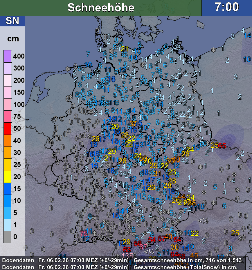 Blicken wir zum Abschluss noch auf die aktuelle Schneedeckenhöhe, so wird deutlich, dass der meiste Schnee in etwa von Nord- über Osthessen nach Thüringen und bis in den Nordosten zu finden ist. Aber auch weite Teile des Nordens und Nordostens konnten noch ein paar Zentimeter Schnee um 7 MESZ melden, während der Westen und Südwesten praktisch schneefrei sind.