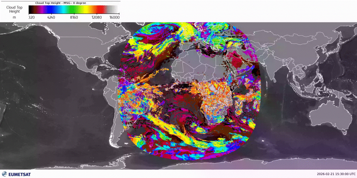 Vorweg ein kurzes Update zum Thema des Tages vom Freitag, dem 20.02.2026: Wirklich klar erscheint die Luft über Suriname im aktuellen Satellitenbild von MTG-I1 (offizieller Betriebsname auch Meteosat-12) nicht, bei beständigem Ostwind zwischen etwa 850 und 500 hPa wurde der Sahara-Staub tatsächlich bis nach Südamerika transportiert. Warum in diesem Höhenbereich? Darunter wird der Staub tendenziell ausgewaschen, darüber dreht der Wind auf West. Soviel nur kurz dazu. Wir bleiben thematisch bei Satellitenbildern, dieses Mal betrachten wir ein hergeleitetes Produkt aus den Messungen des Meteosat Second Generation (MSG) Satelliten Meteosat-10, und zwar…