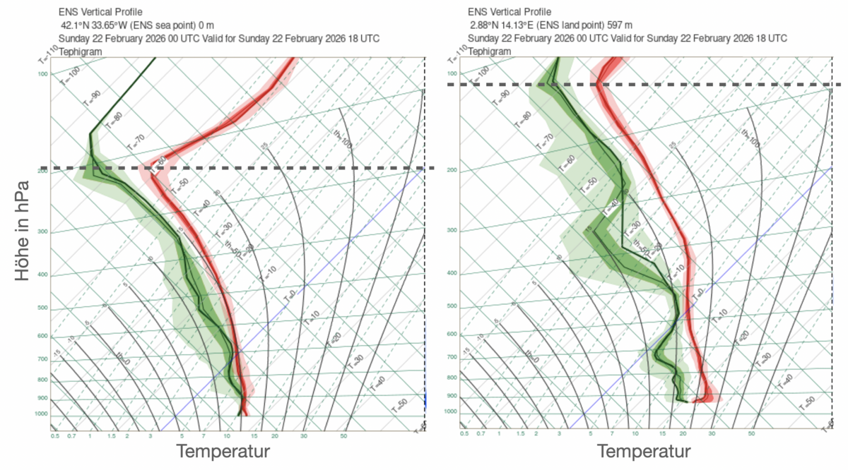 Abbildung 3 zeigt zur weiteren Veranschaulichung zwei Modell-Vertikalprofile der Temperatur aus dem europäischen IFS Modell, links für gestern Nachmittag im Bereich besagter Kaltfront über dem Nordatlantik, und rechts für den Südosten Kameruns. Die Tropopause, jene Grenzschicht welche den Übergang von der Troposphäre zur Stratosphäre markiert, liegt in dem Profil über dem Nordatlantik bei etwa 200 hPa (11 km), in dem tropischen Profil hingegen näher bei 125 hPa. Wie hoch das in Kilometern ist, können Sie unter der Näherung für die exponentielle Druckabnahme mit der Höhe abschätzen, welche besagt, dass sich der Luftdruck alle 5.5 km etwa halbiert (1000 hPa am Boden, 500 hPa in 5.5 km Höhe…). Die Tropopause markiert aufgrund der dort beginnenden Temperaturzunahme die maximal erreichbare Höhe der aufgrund von Auftriebskräften nach oben wachsenden Wolken. Manch eine besonders schwungvolle Wolke mag auch über das Ziel hinaus schießen und wellenartige Dichteschwingungen auslösen – vor allem bei sommerlicher Konvektion lohnt sich hier ein Blick auf das frei verfügbare EUMETSAT MSG Produkt "Rapidly Developing Thunderstorms", also schnell wachsende Gewitterzellen, mit Informationen über das Maß an Überschießen über die Tropopause, verfügbar durch Anklicken der einzelnen Zellen!