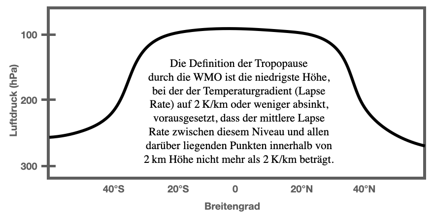 Die beiden Beispiel-Temperaturprofile in Abbildung 3 fügen sich recht gut in die Klimatologie der von der Weltorganisation für Meteorologie (WMO) definierten "Lapse Rate Tropopause" (LRT, die Temperaturgradient-Tropopause). Die Definition der Tropopause, alternative Möglichkeiten sie zu definieren, und ihre Eigenschaften werden wir uns in einem der kommenden Themen des Tages anschauen.