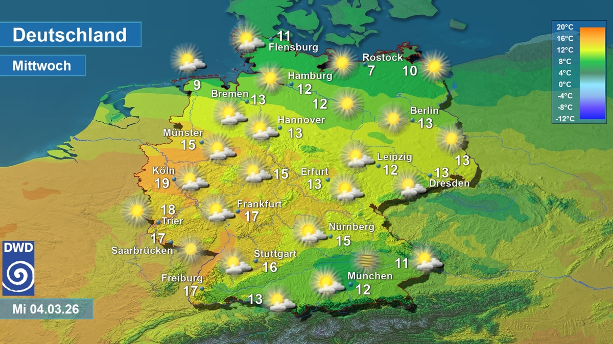 Wetter- und Temperaturkarte, am Mittwoch 04.03.2026. Quelle: Deutscher Wetterdienst