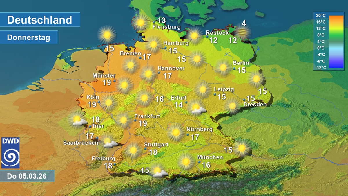 Wetter- und Temperaturkarte, am Donnerstag 05.03.2026. Quelle: Deutscher Wetterdienst