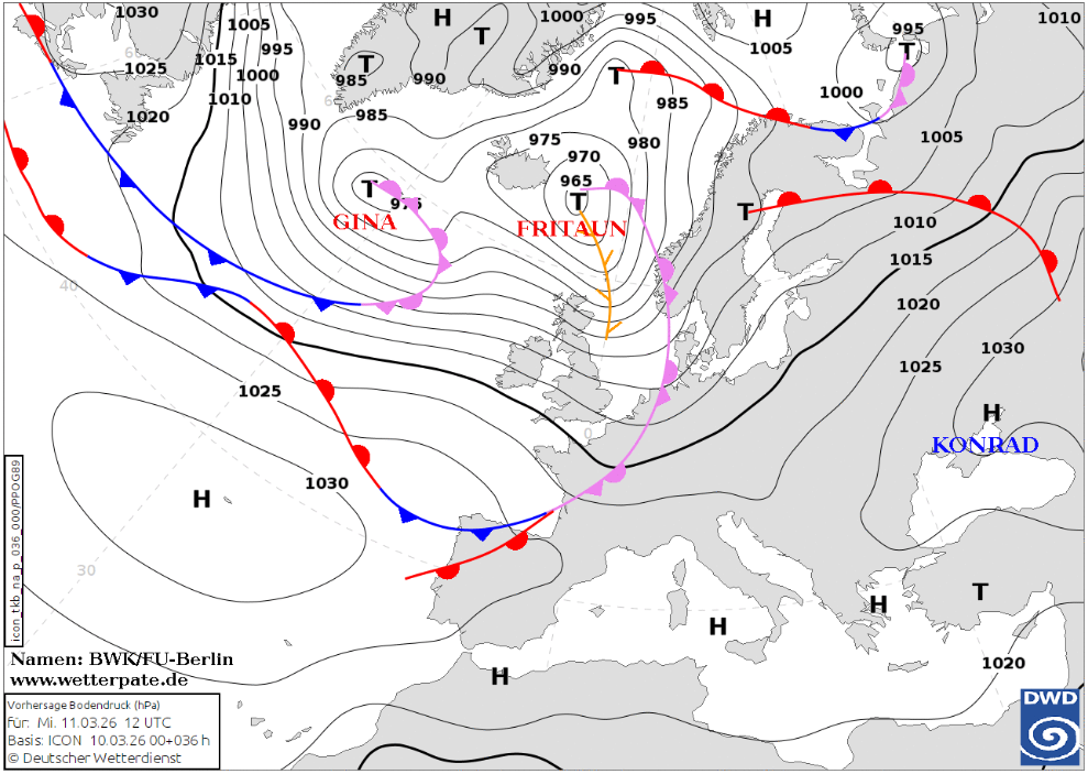 Wie für ein Zwischenhoch aber so üblich hat auch das nicht lange Bestand. Denn am Atlantik tut sich was, weil das umfangreiche Tief FRITAUN Verstärkung von GINA bekommt, woraus sich ein großräumiges Tiefdrucksystem entwickelt. Davon ausgehend greift eine langsam ziehende, teils sogar wellende Kaltfront am Freitag wieder auf den Westen/Nordwesten über und bringt Regenfälle, die mitunter etwas kräftiger ausfallen können.