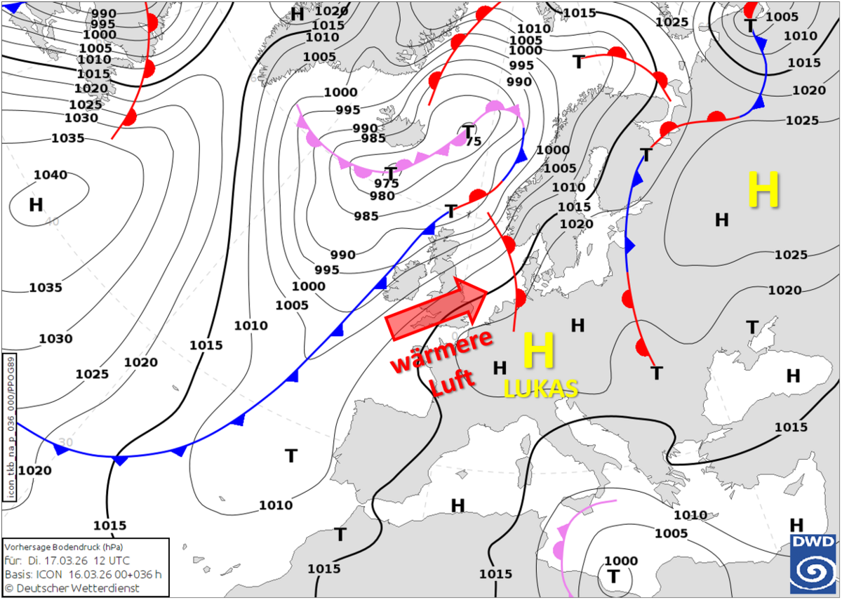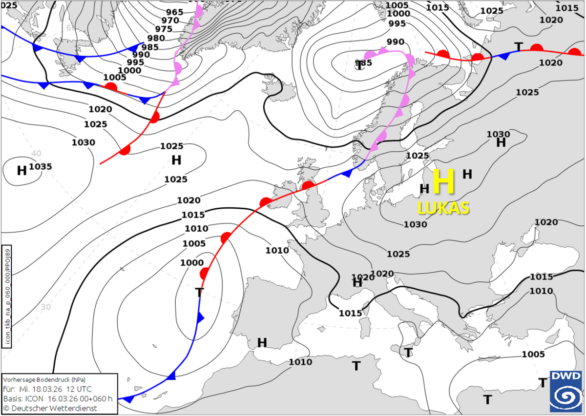 Am morgigen Dienstag dehnt sich ein Hochdruckgebiet von Russland und Nordosteuropa weiter zu uns nach Mitteleuropa aus und wird dort LUKAS genannt (Abbildung 1). Dadurch kommen die Niederschläge und Wolkenfelder der Warmfront nicht mehr bis in den Osten voran (Abbildung 2). Auch in der Westhälfte sorgt der steigende Luftdruck dafür, dass die Regenfälle immer schwächer werden und im Tagesverlauf abklingen. Im Westen ist es also morgen noch oft grau und vielleicht auch anfangs regnerisch, während sich im Osten schon häufiger die Sonne durchsetzt. Mit Temperaturen zwischen 8 Grad in Teilen Südbayerns und 16 Grad am Niederrhein wird es schon wieder etwas milder als heute. Trotz der Wolken wird es also im Westen am wärmsten was der wärmeren Luft hinter der Warmfront geschuldet ist.