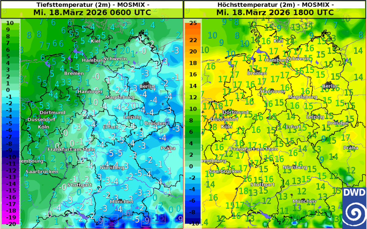 Diese Wetterbesserung setzt sich auch am Mittwoch fort (Abbildung 3). Zuvor müssen wir aber nochmals durch eine kalte Nacht. Mit Ausnahme des Nordwestens und entlang des Rheins, fallen die Temperaturen verbreitet unter den Gefrierpunkt. Vor allem von Bayern über Sachsen bis in den Süden Brandenburgs muss in ungünstigen Lagen sogar mit Tiefstwerten um -5 Grad gerechnet werden (Abbildung 4, links). Empfindliche Pflanzen sollten also vor Frostschäden geschützt werden. Tagsüber treibt viel Sonnenschein zusammen mit der wärmeren Luftmasse dann die Temperaturen aber in die Höhe. Am Nachmittag kommen bei strahlend blauem Himmel und Höchstwerten zwischen 12 und 18 Grad wieder Frühlingsgefühle auf (Abbildung 4, rechts). Ähnlich sieht es auch am Donnerstag aus (Abbildung 5). Vielerorts Sonnenschein und Höchstwerte zwischen 13 und 19 Grad dürften der Vegetation einen weiteren Schub geben. Nur im Norden ziehen im Tagesverlauf Wolken auf, die am Abend in Küstennähe etwas Regen bringen könnten.