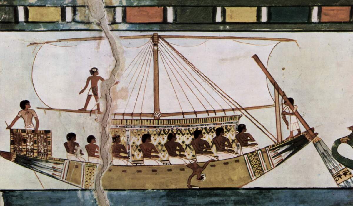 Ägyptisches Segelschiff, Wandbild von ca. 1422?1411 v. Chr., Maler aus der Grabkammer des Menna, Quelle: The Yorck Project über Wikimedia Commons