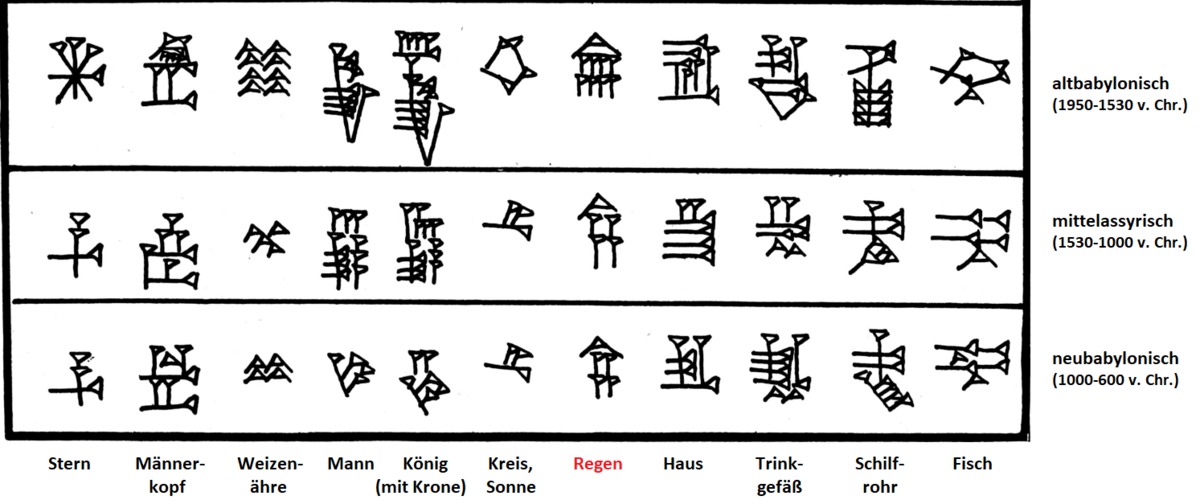 Übersetzung einiger babylonischer Schriftzeichen, Quelle: Ernest A. Wallis und Leonard W. King über Wikimedia Commons