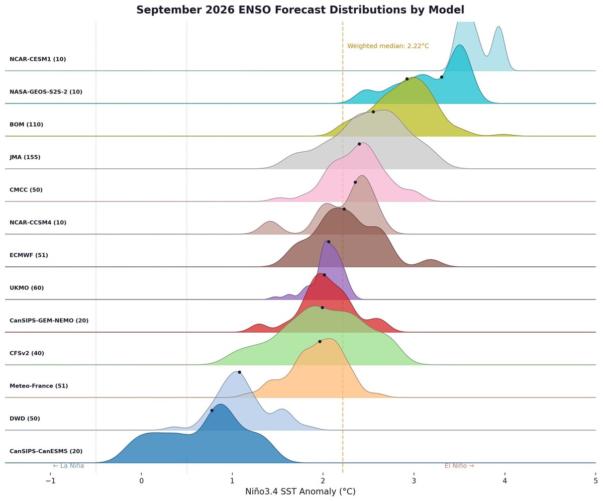 In der vergangenen Woche wurde El-Niño in einigen Medien zum Thema gemacht und tatsächlich liefern verschiedene Modelle deutliche Hinweise auf das Auftreten dieses Phänomens im Laufe des Jahres. Bei genauerer Betrachtung zeigt sich jedoch die Komplexität der Datenlage. In Abbildung 1 sind für den September 2026 von verschiedenen Modellen die prognostizierten Abweichungen der Meeresoberflächentemperatur für den relevanten Teil des Pazifiks dargestellt. Für jedes Modell ist dann nochmal die Bandbreite innerhalb des Modells als Farbbereich aufgetragen. Ab +0,5 Grad Abweichung spricht man von einem El-Niño-Ereignis. Die meisten Modellergebnisse konzentrieren sich bei Anomalien um +2 Grad. Die Bandbreite reicht aber von -0,5 bis +4 Grad. Ab +2 Grad Abweichung spricht man von einem sehr starken El-Niño. Das Modell des Deutschen Wetterdienstes ist dabei ein eher "kühler" Vertreter mit Abweichungen um +1 Grad. Das Modell des Europäischen Zentrums für Mittelfristvorhersage (ECMWF) befindet sich mit etwa +2 Grad Abweichung im Mittelfeld der Modelle.